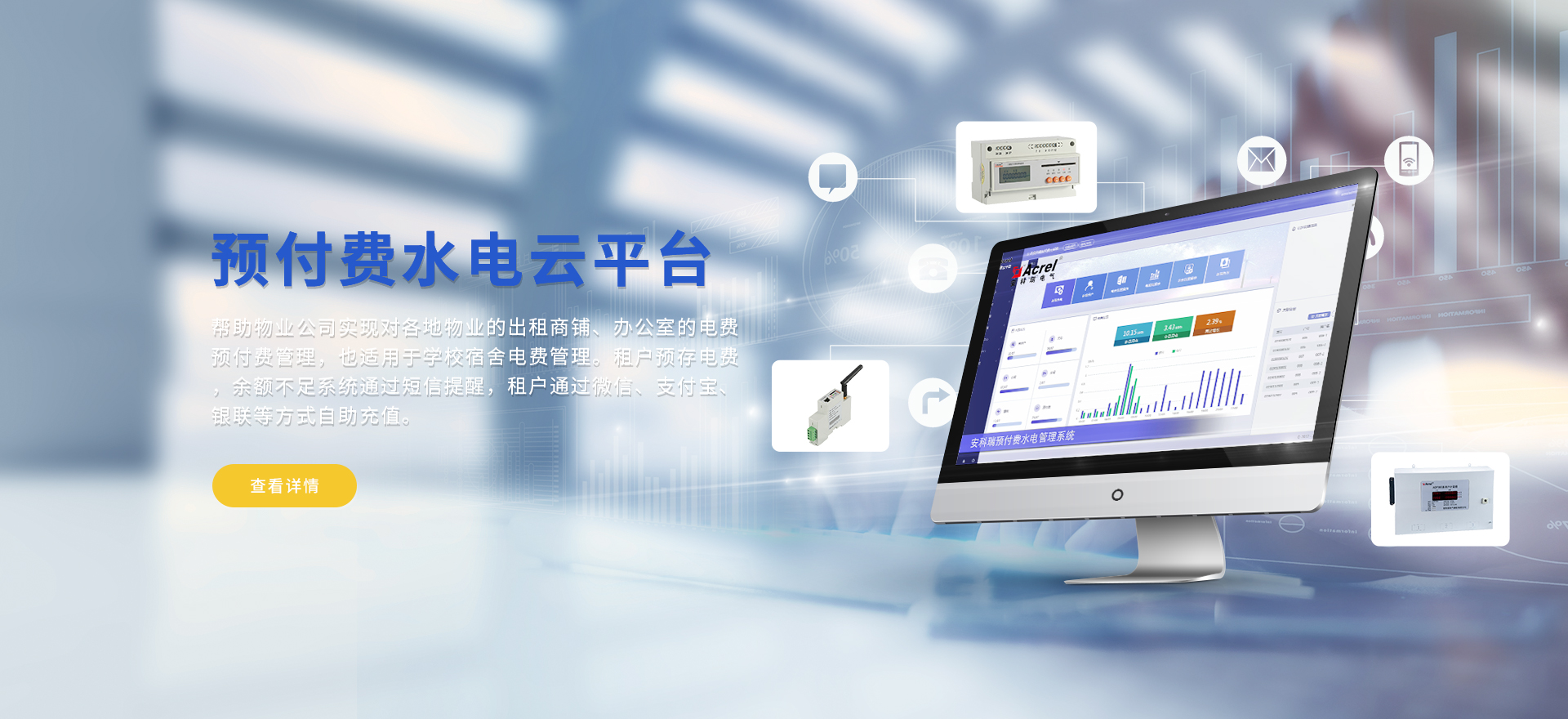 安科瑞提供的解決方案包括Acrel-EIoT能源物聯網云平臺變電所運維云平臺、安全用電管理云平臺環保用電監管云平臺、智慧消防云平臺能源管理云平臺、工業企業能源管控平臺、遠程預付費云平臺、餐飲油煙監管云平臺、電動汽車/電瓶車充電樁收費管理云平臺、電力監控/無線測溫系統、電能質量治理系統、電氣火災監控系統、消防設備電源監控系統、防火門監控系統、應急照明和疏散指示系統、智能照明控制系統、醫用隔離電源絕緣監測系統等,幫助用戶實現能源智能化、可視化、精細化管理,提高用能效率和用能安全,為企業節能降耗和實現能源數字化建設提供數據服務。